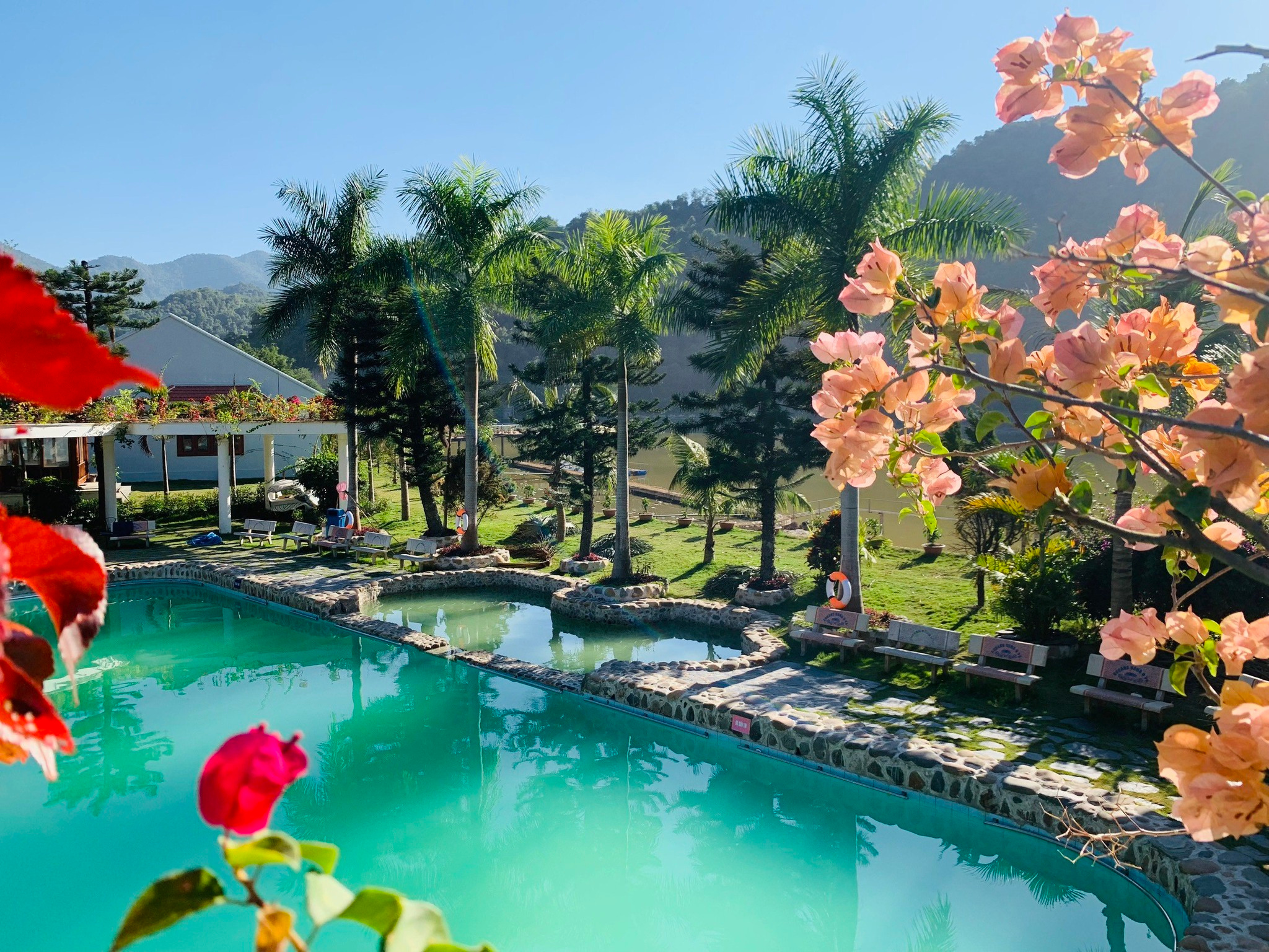 Được bao bọc bởi núi sông hùng vĩ, khu du lịch khoáng nóng Uva quanh năm mát mẻ với khuôn viên rộng, cùng hệ thống bể bơi nằm dưới bóng cây xanh mát, nhà chòi câu cá bên hồ làm bằng tre, sân cỏ vui chơi tạo cảm giác gần gũi với thiên nhiên, giúp du khách tận hưởng trọn vẹn bầu không khí trong lành, an yên.